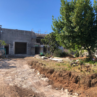 Candy and Cosí arrived on the first direct flight from New York to Rome, July 1. She had to drive from Rome as I did; but I picked her up in Bari. The back window was almost open, and the bathroom was going up. Every day equipment and materials arrived through the opening cut in the back wall, and via the road that had been cut into the garden. The earth taken out was put on the other side of the garden and will be used for leveling and filler.